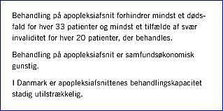 Danmark hører til blandt de bedste i verden, når det drejer sig om behandling af apopleksi. Først og fremmest fordi dækningen med apopleksiafsnit i en international målestok er meget høj. De seneste tal fra NIP viser, at ca. 88% af de patienter, der er indrapporteret til NIP, opnår behandling på et apopleksiafsnit. Da indrapporteringen til NIP stadigvæk ikke er komplet (ca. 11.000 af det forventede antal på 15.000-16.000), og da størstedelen af de indrapporterende afdelinger er apopleksiafsnit, er det nok ikke helt forkert, hvis man skønsmæssigt antager, at op mod 25% af patienterne med apopleksi stadigvæk ikke indlægges på apopleksiafsnit. I betragtning af at etablering apopleksiafsnit udgør et markant kvalitetsløft uden at udgøre en ekstra samfundsøkonomisk belastning, er det svært at forstå, at en livreddende og livskvalitetsforbedrende behandling, som har været kendt og dokumenteret i mere end 15 år, stadig ikke er tilgængelig for alle. Og konsekvensen er åbenbar: minimum 100 unødvendige dødsfald og minimum 200 unødvendige tilfælde af svær invaliditet.