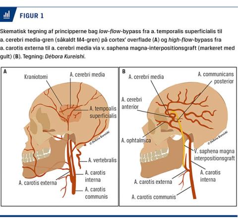 Ved direkte bypass etableres der en anastomose fra et ekstracerebralt kar til et intracerebralt eller mellem to intrakraniale kar. Centralt for direkte bypass er flow af blod i donorkarret (graften), idet dette skal matche behovet for flowforøgelse i modtagekarret (recipienten). Hyppigst anvendes STA som graft, der anastomoseres til en gren af MCA (Figur 1). Der er dog mange andre muligheder (Tabel 1). Ved at anvende en individuel tilgang til behovet for flowforøgelse er det påvist, at STA kan være tilstrækkelig til at erstatte flowet i selv ICA