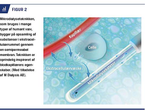 Intracerebral mikrodialyse er i dag den eneste systematisk brugte metode til kontinuerlig analyse af hjernens metabolisme hos neurointensive patienter. Ved hjælp af en balanceret væskeinfusion forbi en semipermeabel membran placeret i hjerneparenkymet måles interstitielle koncentrationer af basale metabolitter, transmittersubstanser, cellekonstituenter og farmaceutiske molekyler alt efter membranporestørrelse og analysemetode (Figur 2).
