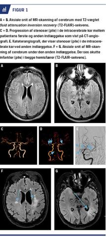 Han blev imidlertid genindlagt fem uger senere pga. forbigående neurologiske udfald. En akut MR-skanning af cerebrum (med diffusion, fluid attenuation inversion recovery (T2 FLAIR)- og T2*-sekvenser) viste fortsat normale forhold. Der blev på ny foretaget CT-angiografi og ultralydskanning af de intracerebrale kar, og der sås progression af de tidligere beskrevne stenoser (Figur 1D). Man supplerede med regelret kateterangiografi, der viste multiple stenoser »som perler på en snor« og affektion af samtlige vaskulære områder, hvilket er karakteristisk for cerebral vaskulitis (Figur 1E). Der blev igangsat en bred udredning af mulige underliggende årsager til cerebral vaskulitis. Clopidogrel blev pauseret mhp. lumbalpunktur. Under indlæggelsen progredierede patientens symptomer imidlertid hurtigt til højresidig hemiparalyse og svær global afasi. En akut MR-skanning af cerebrum viste nu akutte infarkter i begge hemisfærer (Figur 1F og 1G). Man påbegyndte behandling med højdosissteroid og empirisk aciclovir. Der blev foretaget lumbalpunktur på vital indikation. Undersøgelsen viste mononukleær pleocytose på 43 × 106/l, øget CSV-proteinniveau på over 6 g/l og øget immunglobulin (Ig)G i spinalvæsken på over 1 g/l. Der blev påvist intratekal IgG-antistofdannelse mod borrelia, og patienten blev behandlet med intravenøst (i.v.) givet ceftriaxon (2 g × 1 dagligt). Hans tilstand progredierede ikke yderligere efter påbegyndelse af den antibiotiske behandling.