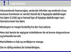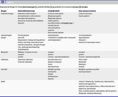 Intracerebrale hæmoragier (ICH), cerebrale infarkter (AIS) og cerebrale sinus venosus-tromboser (CSVT) er samlet blandt de ti hyppigste dødsårsager hos børn (i USA) og er hermed lige så hyppige dødsårsager som hjernetumorer [1, 2]. I amerikansk litteratur er fællesbetegnelsen for disse lidelser stroke. Med denne artikel ønsker vi at øge opmærksomheden på tilstandene, således at relevante patienter bliver udredt og behandlet rettidigt. Da de tre tilstande klinisk kan ligne hinanden, og mange af de disponerende årsager er ens for dem, har vi valgt at behandle dem samlet i én artikel. Neonatale cerebrovaskulære hændelser udgør en speciel undergruppe, hvad angår årsager, symptomer og senfølger, men af pladshensyn omtales de ikke her. Der henvises til relevante artikler [3-5]. Incidensen for ICH, AIS og CSVT opgives som 2-13 pr. 100.000 børn pr. år [6-8]. Omkring halvdelen er blødninger [2, 8]. Forekomsten topper i det første leveår [9, 10]. Den store variation i incidens viser, at der er usikkerhed om den reelle forekomst.