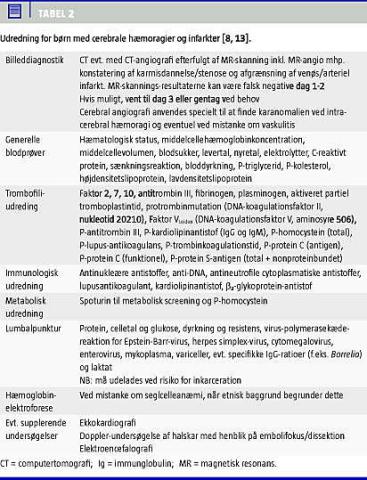 Som led i udredningen af patienter, hos hvem man har mistanke om cerebralt insult, vil der tidligt i sygdomsforløbet blive gennemført billeddannelse med computertomografi (CT) eller magnetisk resonans (MR)-skannin g. Oftest bruges CT til den akutte diagnostik. CT er velegnet til detektering af blødninger. CT-angiografi kan anvendes til diagnostik af karpatologi. MR-skanning, specielt med kontrast, er bedre, når diagnosen AIS skal stilles, og MR-venografi er bedst, når man skal detektere CSVT. Cerebral angiografi anvendes specielt, når man skal finde karanomalien ved ICH, hvor denne undersøgelsesmetode kan give mere diagnostisk information end MR-angiografi [7, 8, 13]. Den videre udredning indbefatter blodprøver i form af rødt og hvidt blodbillede, infektionsprøver, blodsukker, lipider, trombofiliudredning, immunologisk udredning og metaboliske undersøgelser samt evt. hæmoglobinelektroforese (til undersøgelse for SCD), afhængigt af hvilken ætiologi der er mistanke om (Tabel 2 ). Lumbalpunktur (inkl. virusundersøgelse), ekkokardiografi for at diagnosticere kardiel patologi samt eventuelt Doppler-ultralyd af halskarrene for at diagnosticere dissekerende aneurismer skal også overvejes [13].