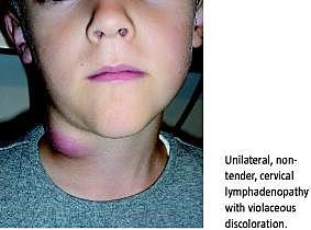Klinisk præsenterer børnene sig med en unilateral persisterende lymfeknudesvulst uden almensymptomer. Lymfeknuden kan perforere til huden, og der kan opstå fisteldannelse med vedvarende sekretion i måneder til år.