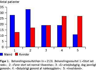 Resultater: 84% af patienterne besvarede spørgeskemaet. 61% af patienterne, herunder 48% af kvinderne og 73% af mændene, fandt behandlingsresultatet tilfredsstillende. Der fandtes ingen sammenhæng mellem opfølgningsperiodens varighed og behandlingsresultatet. Efter operationen var 15 kvinder og 17 mænd blevet tildelt førtidspension på grund af nakkegener. Mænd opnåede signifikant dårligere behandlingsresultat med stigende smertevarighed før operationen. Der fandtes kønsspecifikke sammenhænge mellem lokalisation i columna cervicalis, omfang af det operative indgreb og behandlingsresultatet samt kønsbestemte sammenhænge mellem antal objektive fund ved klinisk undersøgelse og behandlingsresultatet. Vi fandt substantiel korrelation mellem de anvendte effektmål.