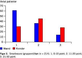 Den summerede smertescore er anført kønsopdelt i Figur 3 . Resultatet er grupperet med følgende tærskelværdipunkter: Smertesum 0-10, smertesum 11-20, smertesum 21-30.
