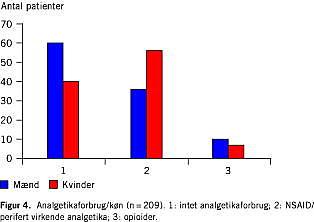 Kvinder opnår en signifikant ringere »Behandlingsresultat«-score end mænd (Mann-Whitney-test, p < 0,0001). Tilsvarende findes for kvinderne en højere samlet smertescore (Mann-Whitney-test, p = 0,0001), større analgetikaforbrug (Mann-Whitney-test, p = 0,04) og højere grad af hæmning i de daglige gøremål vurderet ved CNFDS (Mann-Whitney-test, p < 0,0001).