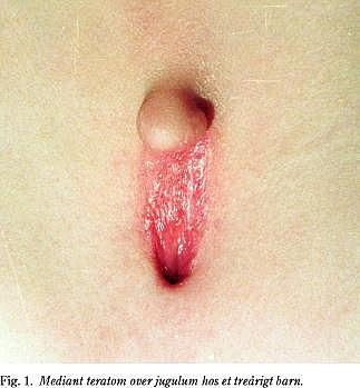 En treårig psykomotorisk retarderet pige, som tillige led af cerebral gigantisme, der var betinget af Dandy-Walkers syndrom, en medfødt hjernemalformation, der involverer 4. ventrikel og cerebellum, blev henvist, da hun siden fødslen havde haft en cervikal proces, som tolkedes som en median halscyste. Klinisk viste denne sig som en fistelgang lige over jugulum med en ærtstor blød hudproces kranialt herfor (Fig. 1 ). Ved CT af halsen og thyroidea-scintigrafi konstaterede man, at processen ikke havde relation til dybden. Ved en operation fandt man ingen fistelgang, kun en smal hudfordybning. Hele området blev excideret og sendt til patologisk undersøgelse, som viste maturt teratom.