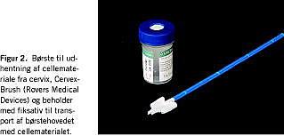 Ved SurePath-væskebaseret teknik, som benyttes på Patologiafdelingen, Hvidovre Hospital, udhentes det relevante cellemateriale fra cervix med en speciel børste, Cervex-Brush (Rovers Medical Devices) (Figur 2 ), og børstehovedet anbringes herefter i en beholder med fiksativ, der sendes til patologiafdelingen, som selv fremstiller og farver prøven. Således er alt det udhentede cellemateriale fra den enkelte kvinde tilgængeligt for undersøgelse ligesom blod, slim og betændelsesceller fjernes i forbindelse med præparationen af materialet (Figur 3 ).