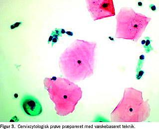 Resultater: Antallet af prøver med diagnosen »normale celler« er faldet med 1% efter indførelsen af den væskebaserede metode, mens andelen af prøver med diagnosen »atypiske celler« og »malignitetssuspekte celler« er steget med henholdsvis 64,3% og 41,2%. Andelen af uegnede prøver er faldet med 84%, mens andelen af prøver uden endocervikale celler er øget med 8,2%. Sammenligning af opfølgende histologi har vist stort set uændret falsk positiv-rate.
