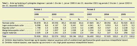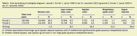 Tabel 1 viser fordelingen af diagnoser på de cervixcytologiske prøver, der blev modtaget i år 1999, 2000, 2001, 2003, 2004 og 2005, i faktiske tal og i procenter. Tabel 2 viser samme data, fordelt på periode 1 og 2. Som det fremgår af tabellerne, modtog afdelingen 183.696 cervixcytologiske prøver i periode 1 og 175.479 prøver i periode 2. Antallet af prøver med diagnosen »normale celler« er faldet fra 84,3% i den første periode til 83,5% i den anden periode. I samme perioder er andelen af prøver med diagnosen »atypiske celler« og »malignitetssuspekte celler« steget fra henholdsvis 2,8% til 4,6% og fra 1,7% til 2,4%. Andelen af uegnede prøver er faldet fra 2,6% i periode 1 til 0,4% i periode 2, mens andelen af prøver uden endocervikale celler er steget fra 8,5% til 9,2%. Samtlige ændringer er signifikante (p < 0,001)