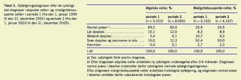 Som det fremgår af Tabel 3, er falsk positiv-raten stort set uændret efter indførelsen af væskebaseret teknik. Således sås der en normal opfølgningsdiagnose i 69,2% og 25,9% af tilfældene i periode 1 og 69,5% og 26,5% af tilfældene i periode 2 efter påvisning af henholdsvis »atypiske celler« og »malignitetssuspekte celler«. Let dysplasi blev påvist i 10,1% og 8,3% af tilfældene i periode 1 og 12% og 8,9% af tilfældene i periode 2 efter fund af henholdsvis»atypiske celler« og »malignitetssuspekte celler«. Moderat dysplasi påvistes i henholdsvis 5,4% og 10,7% af tilfældene i periode 1 og 6,1% og 9,3% af tilfældene i periode 2, svær dysplasi/carcinoma in situ i henholdsvis 15% og 52,4% af tilfældene i periode 1 og 12,3% og 53% af tilfældene i periode 2 og endelig karcinom i henholdsvis 0,4% og 2,7% af tilfældene i periode 1 og 0,1% og 2,3% af tilfældene i periode 2 efter de primære cytologiske diagnoser »atypiske celler« og »malignitetssuspekte celler«.