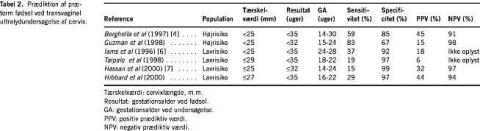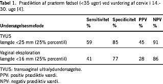 For nogle år siden blev ultralydundersøgelse af cervix introduceret som en mere objektiv metode til vurdering af cervix. Der er anvendt flere metoder til undersøgelsen - transabdominalt, transperinealt og transvaginalt. Den transvaginale metode synes at give det mest præcise mål. I studier, hvor man har sammenlignet vurdering af cervix ved vaginal eksploration og måling af cervix ved transvaginal ultralydskanning (TVUS), har man vist, at man ved brug af TVUS signifikant bedre kan identificere de gravide, der føder prætermt (Tabel 1 ). TVUS har bedre sensitivitet, specificitet og bedre prædiktive værdier, og ved standardiseret teknik er der lav interobservatørvariation (5-10%). De gravides accept af transvaginal ultralydskanning synes generelt at være god.