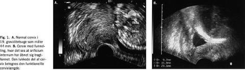 Undersøgelsen foretages med tom blære. Kvinden ligger på et gynækologisk leje eller på et almindeligt leje med en skråpude under sædet. Cervikalkanalen, orificium internum og eksternum identificeres i sagitalt snit, og cervix måles fra orificium internum til orficium eksternum (Fig. 1 ). Der bør observeres i nogle minutter med henblik på at observere eventuelle dynamiske forandringer af cervix. Eventuelt appliceres et tryk på fundus uteri.