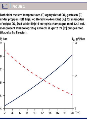c = kH PCO2, hvor kH (Henrys lov-konstant) udtrykker gassens opløselighed i væsken i g/l/bar. De 24 g/l sukker, der typisk tilsættes en flaske hvidvin, vil under andengæringen omsættes til 12 volumenprocent alkohol og 9 g CO2. En idealgas fylder 24 l/mol ved 12 °C; med sin molvægt på 24 g/mol vil de 9 g CO2 i 0,75 l champagne svare til 4,8 l CO2 i gasform [1]. Ved 8-10 °C vil partialtrykket af CO2 i den 25 ml store luftlomme mellem vin og prop være 5-6 bar. Til sammenligning er trykket 6-9 bar i et lastbildæk. Partialtrykket af CO2 skaber et pres på ca. 15 kilo mod