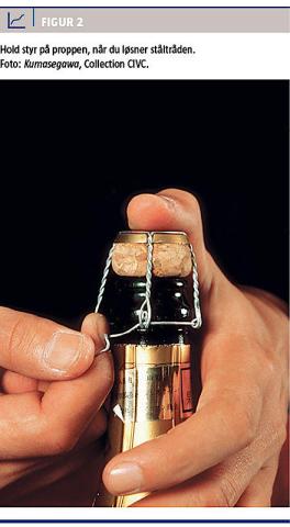 Nogle gange farer proppen af sted i samme sekund, flaskehalsens ståltråd er løsnet (Figur 2), hvilket kommer bag på både vært og gæster. Selv en lynhurtig blinkrefleks (1/10 sekund) kan intet stille op mod et missil, der flyver 14 m/s og rammer hornhinden med 100 atmosfæres tryk [3]. Archer et al har beskrevet svære øjenskader hos ni patienter, der var henvist til Moorfields Eye Hospital efter at være blevet ramt af champagnepropper. Syv læsioner var i venstre øje, hvilket tilskrives den position en flaske typisk vil have ved åbning med højre hånd. En opgørelse af 43 proplæsioner viste, at 26% af de læderede øjne endte med at have en synsrest på ≤ 6/60 [4]. Følg hellere Helmig et al’s retningslinjer for åbning af en flaske champagne: »Temperaturen på 8-10 °C skal overholdes. En hvid serviet skal holdes over proppen og flaskehalsen, mens ståltråden løsnes, proppen skal forsigtigt skubbes bort med fingrene, mens flasken peger bort fra ansigtet i retningen ca. 60 grader mod loftet. Det skal ikke sige »bang«, men give et stort, fugtigt »suk« [5].