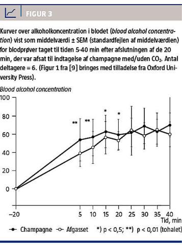 I 1824 gav Henderson den første, lægelige beskrivelse af champagnerusen: »The brisk wines of Champagne intoxicate very speedily, probably in consequence of the carbonic acid gas in which they abound, and the volatile state in which their alcohol is held; and the excitement is of a more lively and agreeable character and shorter duration, than that which is caused by any other species of wine, and the subsequent exhaustion less« [13]. Hypotesen om en hurtig boblerus fandt 100 år senere støtte i resultaterne fra Edkins et al’s eksperimenter med katte, hvor de fandt hurtigere optagelse af alkohol fra maveslimhinden ved tilstedeværelse af CO2 [14]. Først i 2003 blev effekten af champagnebobler studeret hos mennesker. Tolv mænd og kvinder tømte tre glas champagne i løbet af 20 minutter; en uge senere fik de samme ration, men først efter at CO2-boblerne var fjernet med en stavblender [9]. Promillen (blood alcohol concentration) fem minutter efter sidste slurk champagne var højere med bobler i glasset (0,52) end uden (0,40) (Figur 3). Arealet (mg × min/100 ml) under plasmakoncentrationstidskurven var signifikant forskellig i op til 20 minutter efter indtagelsen: 203,08 for champagne med CO2 versus 167,33 for afgasset champagne. Resultatet af en compensatory tracking test 20 minutter efter indtagelsen viste øget cerebral alkoholpåvirkning efter indtagelse af champagne med bobler (196,4 msek) end efter indtagelse af champagne uden bobler (46,3 msek).