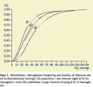 Ligningen har sidenhen været meget brugt til bestemmelse af VD og dannede grundlag for formuleringen af begrebet alveolær ventilation. Ved anvendelse af mere præcist måleudstyr påviste man imidlertid i modsætning til de tidligere fund, at gastransporten i lungerne ikke gik imod, men fulgte trykforskellene mellem alveoleluft og blod. Stadigvæk kunne det være, at sekretion bidrog til transporten, hvis diffusion ikke fuldstændig kunne redegøre for denne. Diffusionen af ilt i lungerne vil være bestemt af disses iltdiffusionskapacitet og middeltrykforskellen for ilt mellem alveoleluft og lungekapillærblod. Med stor originalitet udviklede Bohr kulmonoxidmetoden til bestemmelse af iltdiffusionskapaciteten samt det matematiske grundlag for at beregne den nævnte middeltrykforskel ud fra iltmålinger i alveoleluft og lungearterie- og -veneblod [2]. Med disse redskaber fandt han, at diffusion ikke fuldstændig kunne forklare den øgede iltoptagelse under muskelarbejde. Han fastholdt derfor, at »specifik lungeaktivitet« kan bidrage til iltoptagelsen. Han havde imidlertid anvendt diffusionskapaciteter bestemt under hvile. Da det siden viste sig, at diffusionskapaciteten kan øges under arbejde, især gennem kapillærrekruttering, fik han kun ret, såfremt denne ændring i funktionel lungestruktur ses som en »specifik lungeaktivitet« [2]. Sideløbende med de beskrevne studier påviste Bohr , at hæmoglobin har stor betydning for binding af kuldioxid i blod, at hæmoglobinets iltbindingskurve er S-formet, og at kuldioxid hæmmer bindingen af ilt til hæmoglobin (Figur 1 ). Bohr blev indstillet til Nobelprisen tre gange, men det var en af hans mange elever [1-3], August Krogh , der fik den for arbejde med en problemstilling analog til Bohrs . Bohr citeres, og hans indsats værdsættes stadig internationalt [2, 4]. Den byggede på solid indsigt i matematik, fysik og kemi, men hans interesser spændte fra poesi til fodbold. Han døde midt i sit arbejde, morgenen efter at sønnen Niels havde færdiggjort sin banebrydende disputats.