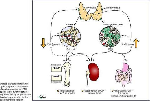Plasmacalcium er under normale forhold nøje reguleret via de kalcitrope hormoner, parathyroideahormon (PTH), 1,25-dihydroxy-D-vitamin og i mindre grad kalcitonin. Calciumsensorreceptoren (CaSR) registrerer direkte koncentrationen af ekstracellulært calcium. Denne receptor findes primært i glandulae parathyroideae, C-cellerne i glandula thyroidea, cellerne i nyretubuli samt i osteoblaster og osteoklaster [1]. Receptoren har sin hovedvirkning på calciumstofskiftet via glandulae parathyroideae, hvor den medierer calciumionens regulering af PTH-sekretionen i et omvendt sigmoidalt forhold (Figur 1 ). Ved langvarig hypokalcæmi stimuleres desuden proliferationen af parathyroideaceller via CaSR, hvilket kan medføre hyperplasi.