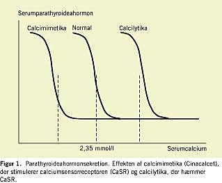 Cinacalcet tilhører gruppen af calcimimetika [2]. Disse stoffer virker som agonister på CaSR, hvorved følsomheden for plasmakalcium øges. Når følsomheden øges, falder PTH-sekretionen - kurven venstreforskydes (Figur 1). Præparatet gives peroralt. Biotilgængeligheden er 20-25%. Samtidig fødeindtagelse øger biotilgængeligheden med 50-80%. Maksimal plasmakoncentration nås efter 2-6 timer. Steady state -plasmakoncentration indtræder i løbet af syv dage. Stoffet metaboliseres i leveren via CYP3A4 og CYP1A2 til inaktive metabolitter. Eliminationen er bifasisk med plasmahalveringstider på henholdsvis ca. 6 timer og 30-40 timer.