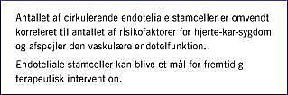 Der har i de senere år været en eksplosiv udvikling inden for stamcellebiologien, bl.a. med udforskning af mulighederne for regenerativ terapi ved kardiovaskulær sygdom. Resultaterne af eksperimentelle undersøgelser har vist, at stamceller fra knoglemarven kan uddifferentiere til hjertemyocytter og forbedre hjertefunktionen efter myokardieinfarkt, ligesom f.eks. skeletale myoblaster kan opnå viabel forankring og funktionel integration i myokardiet [1]. Der er også fokus på regenerative processer i karvæggen, ikke mindst mhp. terapeutisk anvendelse af såkaldte endothelial progenitor cells (EPCs). Disse »endoteliale stamceller« kan defineres operationelt som celler, der modningsmæssigt ligger i transit imellem »ægte«, multipotente, selvfornyende stamceller og en uddifferentiering til modne endotelceller [2]. EPCs er identificeret i perifert blod og knoglemarv via ekspression af visse overflademarkører (f.eks. CD34, CD133 og VEGFR-2), som bl.a. kan påvises ved fluorescensaktiveret cellesorteringsanalyse eller immuncytokemisk farvning af cellekulturer, men der er endnu ikke fuld klarhed over cellernes stamtræ og fænotype. Der er imidlertid indløbet en mængde data om mekanismerne ved EPCs rekruttering, mobilisering, målsøgning (homing ), differentiering, postnatal neovaskularisering og potentielle terapeutiske applikationer, herunder f.eks. med påvisning af EPC-mobilisering fra knoglemarv til blodbane ved vævsiskæmi, virkninger af angiogene cytokiner og stimulation af visse EPC-processer ved behandling med f.eks. statiner eller erytropoitin. Blandt de mange perspektivrige resultater skal her fremhæves sammenhængen mellem EPCs og traditionelle kardiovaskulære risikofaktorer.
