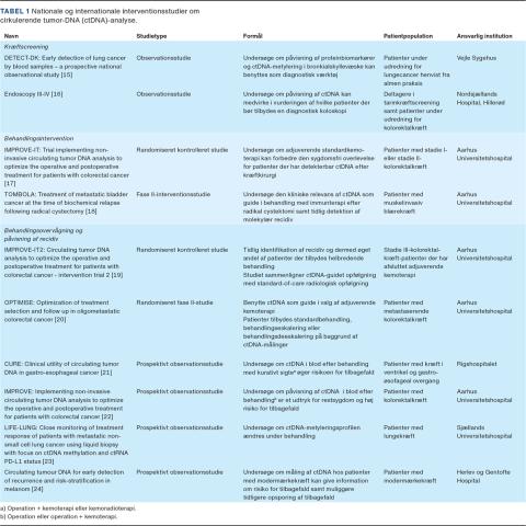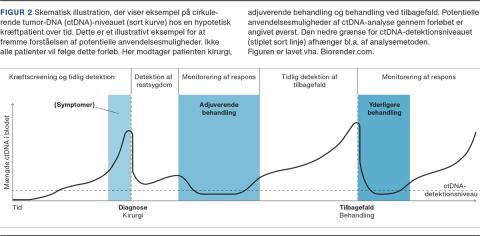ctDNA-analyse er et relativt nyt felt, som har stort potentiale inden for kræftdiagnostik og -behandling (Figur 2). Allerede på nuværende tidspunkt benyttes ctDNA-analyse som guide i nationale og internationale interventionsstudier (Tabel 1). Målet med disse studier er at skabe dokumentation for de kliniske fordele ved implementering af ctDNA-baseret beslutningstagen. I takt med gennemførelsen af de nævnte studier forventes det, at ctDNA-analyse bliver trinvist implementeret i klinisk praksis. Vi forventer, at ctDNA inden for en tidsramme på 3-5 år vil blive brugt til detektion af minimal restsygdom og recidiv samt ved monitorering af sygdom og resistensudvikling. I de følgende afsnit vil vi fokusere på disse anvendelsesmuligheder.