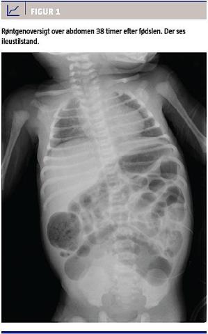 På grund af manglende mekoniumafgang blev der 38 timer efter fødslen foretaget en røntgenoversigt over abdomen, hvorved man fandt en ilieustilstand (Figur 1). Ved laparotomi fandt man dilateret tarm ned til den peritoneale omslagsfold ved rectosigmoideum, hvorfor man på mistanke om mb. Hirschsprung anlagde en descendendostomi med blindlukning af rectum. Diagnosen blev senere bekræftet ved en biopsi fra rectum. Postoperativt fik barnet adominalt kompartmentsyndrom og måtte reopereres med resektion af et 3 cm langt stykke iskæmisk tyndtarm. Herefter var der er et ukompliceret forløb.