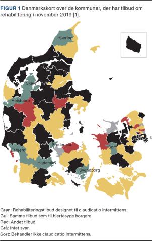 Det kan synes besynderligt, at vi i Danmark, trods den stærke evidens for effektiviteten af superviseret gangtræning og de kraftigt opfordrende guidelines, endnu ikke har et struktureret systemisk rehabiliteringsprogram, hvori superviseret gangtræning indgår. Et nationalt studie lavet i samarbejde med Dansk Hjerterehabiliteringsdatabase fra 2019 viste, at kun 12% af danske karkirurger henviser deres patienter til rehabilitering, men at hele 96% ville henvise deres patienter, hvis de kendte til et rehabiliteringsprogram [1]. Ingen sygehuse og kun 8,3% af kommunerne tilbyder superviseret gangtræning til CI-patientgruppen. Flere kommuner behandler patienter med CI på hold med hjertesyge borgere (se Figur 1). Typisk anses CI som en komorbiditet, som man i varierende omfang tager hensyn til under planlægningen af rehabiliteringsforløbet. Danske karkirurger anbefaler på nuværende tidspunkt patienter, som lider af CI, at gangtræne usuperviseret.