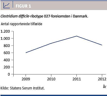 C. difficile-infektion forekommer med stigende hyppighed i det danske samfund. Et studie af Fenger et al viste, at eksposition for C. difficile, målt ved antistofforekomst, steg fra 19% til 27% i årene 1990-1998 [6], og at 30% af de diagnosticerede sygdomstilfælde var samfundserhvervede [7]. Imidlertid er det C. difficile-027-udbruddet på hospitaler og plejehjem på Sjælland, der især har skabt problemer siden 2008 [1]. Forekomsten af denne type anses for delvist for at være betinget af den tiltagende anvendelse af cefalosporiner og quinoloner [8], og det er velbelyst, at infektion med C. difficile-027 medfører øget sværhedsgrad, dødelighed og recidivfrekvens [2, 9].