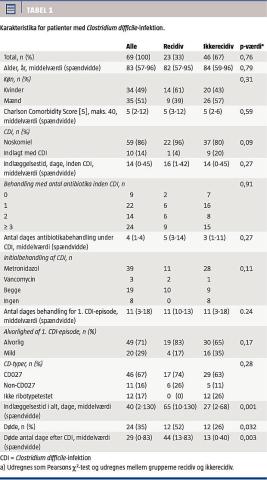 Patienterne blev opdelt i to grupper: 1) ingen recidiv af C. difficile-infektion og 2) recidiv enten under indlæggelse eller ved ny indlæggelse inden 60 dage efter seneste episode.
