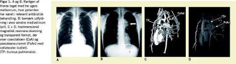 En 18-årig mand blev indlagt efter ti dages febrilia, opkastninger, ledsmerter og hævelse af højre ankelled. Tolv dage tidligere havde han bidt sig i tungen med efterfølgende halvanden times kraftig blødning. Objektivt fandt man blodtryk (BT) på 140/65 mmHg, puls 96, temperatur 39,3°C. Ved stetoskopi hørtes en systolisk mislyd over prækordiet med udstråling til carotiderne. Der blev beskrevet pulse i aa radiales og aa dorsales pedes. Paraklinisk fandt man C-reaktivt protein på 148 og leukocytter på 20,5. Et elektrokardiogram viste sænkningsreaktion uden tegn på venstre ventrikel-hypertrofi. Ankelledet punkteredes uden positive fund. Intravenøs behandling med penicillin 5 MIE ×4 og gentamycin 120 mg×2 blev påbegyndt og senere skiftet til diclosil efter bloddyrkningssvar (staphylococcus aureus ). Ekkokardiografi udført på et lokalsygehus gav mistanke om endokarditis på tricuspidalklap, og patienten blev henvist til Rigshospitalet til transtorakal (TTE) og transøsofageal ekkokardiografi (TEE). Endokarditis kunne ikke bekræftes, men antibiotikabehandlingen blev anbefalet fortsat på lokalsygehuset. Patienten blev udskrevet tre uger efter indlæggelsen med normalt resultat af røntgenundersøgelse af thorax (Figur 1A ) til intravenøs antibiotisk behandling foretaget af en hjemmesygeplejerske. En måned senere klagede patienten over hoste og synkebesvær. En røntgenundersøgelse af thorax viste nu nytilkommen breddeøget øvre mediastinum (Figur 1B). En efterfølgende computertomografi (CT) med kontrast (Figur 1C) viste betydelig dilateret aorta, der begyndte før arcus, bredte sig til efter arcus og målte 8 ×10 ×7cm. Patienten blev overflyttet til Cardiologisk Afdeling på Rigshospitalet. Han var upåvirket, uden smerter og havde et BT på 180/80 mmHg. Ved stetoskopi hørtes fortsat kraftig systolisk mislyd over prækordiet. Der blev beskrevet normal puls i ekstremiteterne. TTE viste ingen forandringer i hjertet og i de første 3-4 cm af aorta. Man havde således stadigvæk ingen forklaring på den systoliske mislyd. Infektionsparametre var normaliserede. Mistanke om usurer ved eftergranskning af røntgenoptagelsen af thorax og en meget lille aorta descendens på CT'en vakte endelig mistanke om CoA. Ved fornyet objektiv undersøgelse føltes nu ingen puls i femoralarterierne! Ny TTE og magnetisk resonans (MR)-skanning (Figur 1C+D) bekræftede mistanken om CoA kompliceret med et aneurisme og store kollateraler til aortaaneurismet. Ved akut venstresidig torakotomi fandtes CoA på det typiske sted lige efter venstre a. subclavia med kun to millimeters åbning og direkte herunder en 1-2 cm stor åbning til et mykotisk pseudoaneurisme beliggende i venstre lunges overlap. Selve aneurismet målte 10 cm. Distale aorta descendens målte 8 mm. Ved operationen blev CoA og aneurismet reseceret, og aorta descendens blev rekonstrueret med en rørprotese. På den første postoperative dag var patienten uklar og havde nedsat kraft og sensibilitet i højre arm. Symptomerne remitterede dog hurtigt, og patienten blev udskrevet i velbefindende otte dage efter operationen med metoprolol mod hypertension.