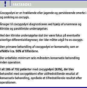 På baggrund af den gennemgåede litteratur anbefales inden evt. operation en klinisk undersøgelse med fokus på eventuelle alvorlige differentialdiagnoser, der ikke måtte udgå fra os coccygis. Der anbefales minimum seks måneders uvirksom konservativ behandling [3, 5, 9] samt laterale røntgenoptagelser med henblik på at udelukk e alvorlige differentialdiagnoser og som hjælp til at planlægge en eventuel operation. Diagnostisk lokal injektion og dynamiske røntgenoptagelser er ikke standard, men kan måske være vejledende og hjælpe med at identificere de patienter, som vil have størst sandsynlighed for at have gavn af operationen. Dynamiske røntgenoptagelser kan ikke bruges til at ekskludere patienter, da der er fundet både patologiske og normale optagelser hos coccygodynipatienter med godt operativt resultat. Alle patienter bør modtage profylaktisk antibiotika. Der er ikke konsensus om, hvor længe denne bør gives, men i det eneste studie uden postoperative infektioner gav man profylaktisk antibiotika i fem døgn [35].