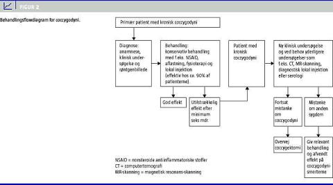 Den primære behandling af coccygodyni er konservativ [3, 7, 9, 10, 20, 21], som er effektiv i ca. 90% af tilfældene [3, 4]. Konservativ behandling består typisk i anvendelse af nonsteroide antiinflammatoriske stoffer, oppustelige sidderinge, instruktion i korrekt sidestilling, manuel terapi, hvor en behandler rektalt manipulerer os coccygis, fysioterapi, varme bade og lokale injektioner med binyrebarkhormon [3, 8, 16, 22, 23]. Nogle patienter har ingen eller meget beskeden gavn af konservativ behandling og udvikler kronisk coccygodyni med intraktable smerter. Til denne gruppe af patienter kan coccygektomi overvejes [8, 24] (Figur 2 ).