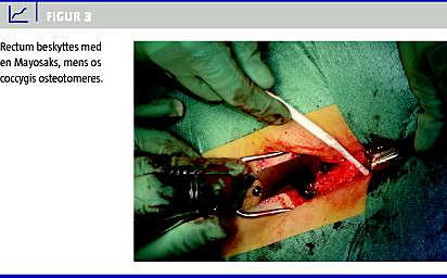 Operationen forgår i universel anæstesi eller spinalanæstesi med patienten i bugleje. Der foretages et longitudinelt midtlinjesnit over os coccygis. Bløddelene løsnes subperiostealt fra os coccygis og herefter foretages total eller delvis resektion af halebenet med osteotom, mens rectum skånes ved at holde f.eks. en saks mellem rectum og os coccygis. Efterfølgende afrundes den afskårne kant på os sacrum. Hæmostasen sikres med elkoagulation og bone wax [3], og vævet lukkes lagvist (Figur 3 ).