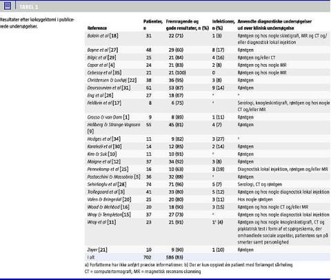 Den største undersøgelse er foretaget af Sehirlioglu et al [28], der opererede 74 patienter med traumatisk coccygodyni og opnåede et fremragende resultat i 96% af tilfældene. I de 24 originalartikler opnåede 586 af 702 patienter, der blev opereret med coccygektomi, et fremragende eller et godt resultat, hvilket svarer til et tilfredsstillende resultat i 83% af tilfældene (Tabel 1 ).