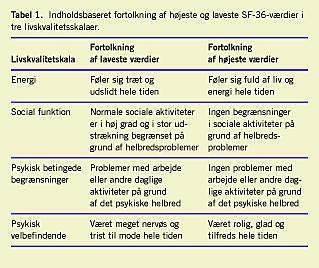 Besvarelserne blev kodet, omkodet, beregnet og transformeret til en skala fra 0 (værst mulige helbred) til 100 (bedst mulige helbred) i overensstemmelse med de metoder, som er beskrevet i [4]. En indholdsbaseret fortolkning af højeste og laveste værdier i hver skala ses i Tabel 1. Denne fortolkning er nærmere beskrevet i [4].