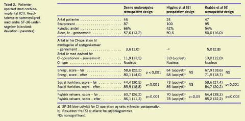 Higgins et al [6] offentliggjorde i 2002 en prospektiv SF-36-spørgeskemaundersøgelse med 48 patienter, der var delt op i to grupper. I den ene gruppe havde alle modtaget CI af typen Clarion og i den anden gruppe af typen Nucleus. Det er uklart, hvorvidt patienterne deltog anonymt. Også i Higgins' undersøgelse stemmer patientkarakteristika godt overens med vores. Higgins et al fandt kun en signifikant forbedring af livskvalitet i skalaen »psykisk velvære«, mens de andre skalaer ikke viste signifikant forbedret livskvalitet (Tabel 2).