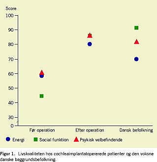 I Figur 1 sammenlignes livskvaliteten før og efter CI-operationen grafisk med livskvaliteten hos den danske baggrundsbefolkning. Oplysningerne vedrørende den danske befolkning stammer fra [4]. Undersøgelsesgruppen bestod af 4.080 voksne (16 år eller mere) ikkeinstitutionaliserede personer udtrukket fra Det Centrale Personregister. Vores patienter havde før CI-operationen en ringere livskvalitet end baggrundsbefolkningen havde. Efter ope rationen var livskvaliteten bedre hos CI-patienterne end hos baggrundsbefolkningen inden for skalaerne »energi« og »psykisk velbefindende«, mens livskvaliteten inden for skalaen »social funktion« viste en meget markant forbedring, men dog lidt dårligere end baggrundsbefolkningen.
