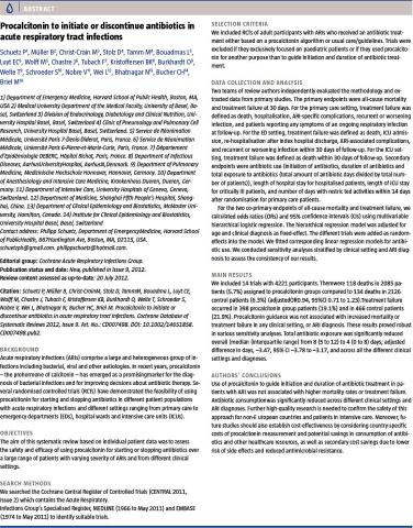 Antimicrobial resistance towards antibiotics is an increasing issue for the international society. A Cochrane meta-analysis regarding procalcitonin (PCT) as guidance for initiating and discontinuation of antibiotic treatment in respiratory tract infections in a total of 4,221 patients in various care settings has shown promising results for guiding treatment with a PCT cut-off of 0.25 ng/ml, although more research is needed to clarify possible risks to the approach, especially in intensive care units.