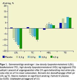 Effekt og sikkerhed for colesevelam er undersøgt i flere dobbeltblindede, placebokontrollerede undersøgelser, hvor præparatet er blevet givet som monoterapi eller som supplement til statinbehandling til patienter med primær hyperkolesterolæmi (LDL-kolesterol mellem 3,5 mmol/l og 6,0 mmol/l) efter en indledende diætperiode. Resultaterne fra en undersøgelse af colesevelam givet til 494 patienter som monoterapi [1] er vist i Figur 1 . I en anden undersøgelse [2] med 251 patienter reducerede seks ugers kombinationsbehandling med colesevelam 2,3 g plus simvastatin 20 mg eller colesevelam 3,8 g plus simvastatin 10 mg LDL-kolesterol med 42% sammenlignet med 34% på simvastatin 20 mg givet som monoterapi og 16% på colesevelam 3,8 g givet som monoterapi. Simvastatin alene eller i kombination med colesevelam sænkede plasmatriglycerid signifikant, mens colesevelam i monoterapi øgede triglycerid med 11%. Tilsvarende resultater fandtes i en undersøgelse med 94 personer [3], hvor behandling med colesevelam 3,8 g plus atorvastatin 10 mg reducerede LDL-kolesterol med 53%, hvilket svarede til effekten af atorvastatin 80 mg givet som monoterapi. High density lipoprotein (HDL)-kolesterol blev øget signifikant hos alle deltagerne, men mest i gruppen, der fik colesevelam plus atorvastatin (11%). Plasmatriglycerid blev øget med 10% ved monoterapi med colesevelam, men fandtes reduceret hos alle andre, der fik aktiv behandling, dog kun signifikant ved behandling med atorvastatin i monoterapi. I undersøgelser er det påvist, at den maksimale terapeutiske effekt af colesevelam opnås efter ca. to ugers behandling, og at den er stabil. Colesevelam er endnu ikke blevet sammenlignet med andre anionbyttere i kontrollerede undersøgelser in vivo.