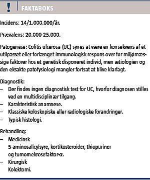 Colitis ulcerosa (UC), der først blev beskrevet af patologen Samuel Wilks i 1859, er den hyppigste af de inflammatoriske tarmsygdomme; Crohns sygdom (CD) er næsthyppigst. UC er en diffus, uspecifik inflammation i colonmucosa og involverer næsten altid rectum (proktitis). Sygdomsudbredelsen går fra kun at afficere rectum til at omfatte hele colon (Figur 1) [1].