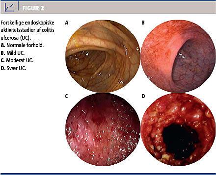 Det kliniske forløb ved UC er karakteriseret ved vekslende perioder med remission og opblussen. På diagnosetidspunktet har patienterne oftest milde til moderate symptomer, og mindre end 10% har svær aktiv sygdom [20]. I et populationsbaseret studie med 843 patienter forblev 55% i klinisk remission eller havde milde symptomer efter ti års followup; 37% havde et kronisk intermitterende forløb, og 6% havde et kronisk kontinuert forløb [21].