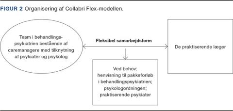 Fordi det var nødvendigt at gennemføre et nyt randomiseret forsøg, blev det muligt at benytte de indhentede erfaringer fra delprojekt 2-4 og videreudvikle CC-modellen (Figur 1). I dette arbejde inddrog man også viden fra den engelske model Improving Access to Psychological Therapies (IAPT) [27], hvorfor det nu er muligt for den praktiserende læge at vælge, at CC-indsatsen foregår i et team placeret uden for vedkommendes praksis. Collabri Flex er en mere fleksibel model end den første Collabri-model og kan kort organisatorisk skitseres som vist i Figur 2. Resultaterne fra seksmånedersopfølgningen i Collabri Flex er lovende. På baggrund af disse resultater har Sundhedsministeriet netop bevilliget midler til et implementeringsstudie.