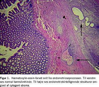 Makroskopisk sås et 10 cm langt colonresektat med en centralt placeret stenoserende tumorlignende proces. Processen målte 3 cm i bredden, 6 cm i længden og strakte sig op til 3 cm profund for tunica muscularis. Tarmslimhinden var uden patologiske forandringer. Ved en mikroskopi fandtes tarmslimhinden uden patologiske forandringer, og i tunica muscularis sås talrige aflange kirtelstrukturer. Disse var beklædt med et let hyperplastisk endometrielignende epitel omgivet af et cytogent stroma. (Figur 1 ). Morfologien og den efterfølgende immunohistokemi bekræftede diagnosen endometriose.