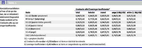 Mål for skalaernes konstruktionsvaliditet fremgår af Tabel 1 . Cronbachs alfa var tilfredsstillende for stort set alle skalaer, hvilket tyder på tilfredsstillende statistisk reliabilitet. Vurderet ud fra Loevinger-koefficienterne var alle skalaer, fraset SCL-12, unidimensionelle. Konstruktionsvaliditeten var generelt højest på SCL-4/6/8/13 (angst/depression/psykisk lidelse) og CAGE (alkoholafhængighed), og tilsyneladende højere blandt mænd end kvinder. SCL-4/8/12 (angst/psykisk lidelse generelt/fysiske symptomer) og Whiteley-7 (sygdomsbekymring) fungerede bedre blandt unge end blandt ældre patienter, hvilket muligvis var pga. den aldersrelaterede højere forekomst af somatisk komorbiditet.
