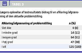 I 89% af tilfældene oplevede lægen, at besvarelsen i nogen eller høj grad bidrog til afklaring af den aktuelle problemstilling (Tabel 3 ).