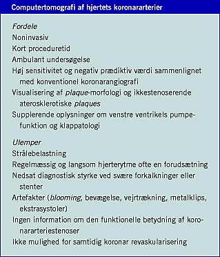 CT-KAG er et lovende nyt noninvasivt alternativ/supplement til konventionel KAG. Den endelige plads i udredningsalgoritmen for CAD er endnu ikke fuldt belyst. Foreløbige resultater har vist en høj diagnostisk sikkerhed i selekterede patientgrupper - især hvad angår sensitivitet og negativ prædiktiv værdi. Metoden synes velegnet hos patienter med stabil angina og/eller intermediær prætestsandsynlighed for CAD.