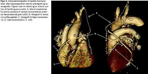Tilsvarende problemer gør sig gældende ved tidligere bypassopererede patienter (metalklips, lille kardiameter ved anastomoserne og udbredte forkalkninger af de genuine kar). Nylige studier har dog også her vist en høj diagnostisk sikkerhed [10], og specielt ved problemstillinger, hvor det kun drejer sig om visualisering af bypassgrafter, vil metoden være velegnet (Figur 3).