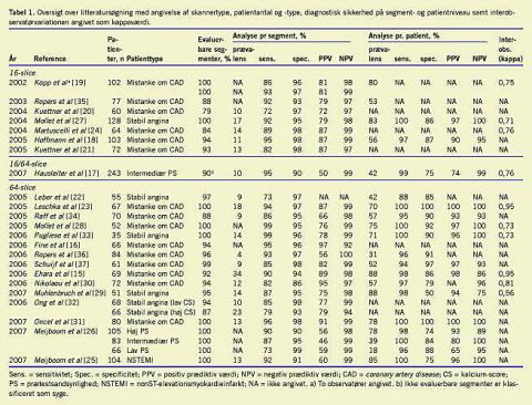 Der blev foretaget søgning på MEDLINE i perioden januar 2002 til januar 2008 med MeSH-søgeordene: computed tomography, coronary disease og coronary angiography. Studier, som omhandlede plaque -morforlogi, stenter, bypassgrafter, perfusion, hjerteklapper og pumpefunktion er udeladt. I alt 34 relevante engelsksprogede publikationer, der sammenligner CT-KAG med konventionel-KAG, blev fundet. Samtlige studier med 64-slice-CT og de otte største studier med 16-slice-CT er medtaget i denne oversigt. De nyeste oversigtsartikler på området er gennemgået for oversete studier, og tre metaanalyser blev identificeret [4, 13, 14]. Der var ingen relevante resultater ved søgning i Cochrane-databasen.