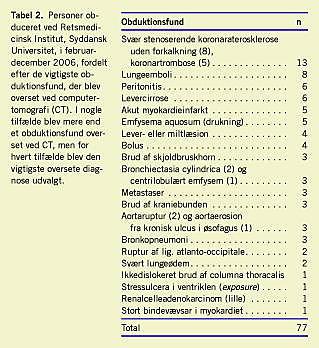 Resultater: I 9% af tilfældene blev vigtige CT-fund overset ved obduktionen, og i 51% blev vigtige obduktionsfund overset ved CT. Dødsårsagen kunne fastslås ved CT i 30%, ved obduktion i 72% og ved retskemisk undersøgelse i 21% af tilfældene. CT var især nyttig ved voldelige dødsfald.