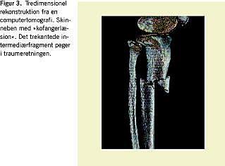 Ved obduktion af trafikdræbte er CT en stor hjælp [19]. Forskellige ulykkestyper har hver deres karakteristiske læsionsmønster, som kan fortælle meget om traumemekanismen. Fodgængere, som rammes af en bil, kan få et karakteristisk skinnebensbrud med et trekantet intermediær fragment, hvis spids peger i traumeretningen (Figur 3). CT er også velegnet til undersøgelse af voldsofre (Figur 4), herunder børn hos hvem forekomst af knoglebrud af forskellig alder tyder på gentagne voldsepisoder.